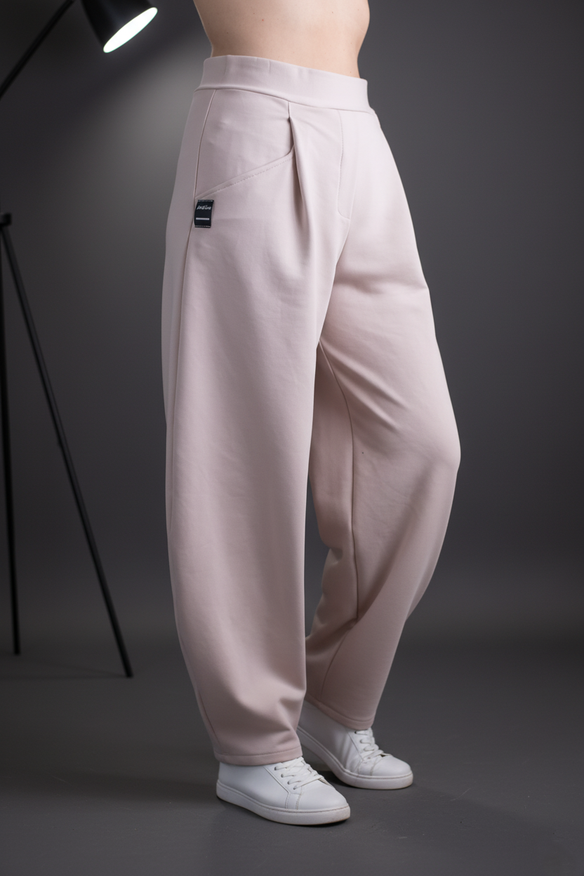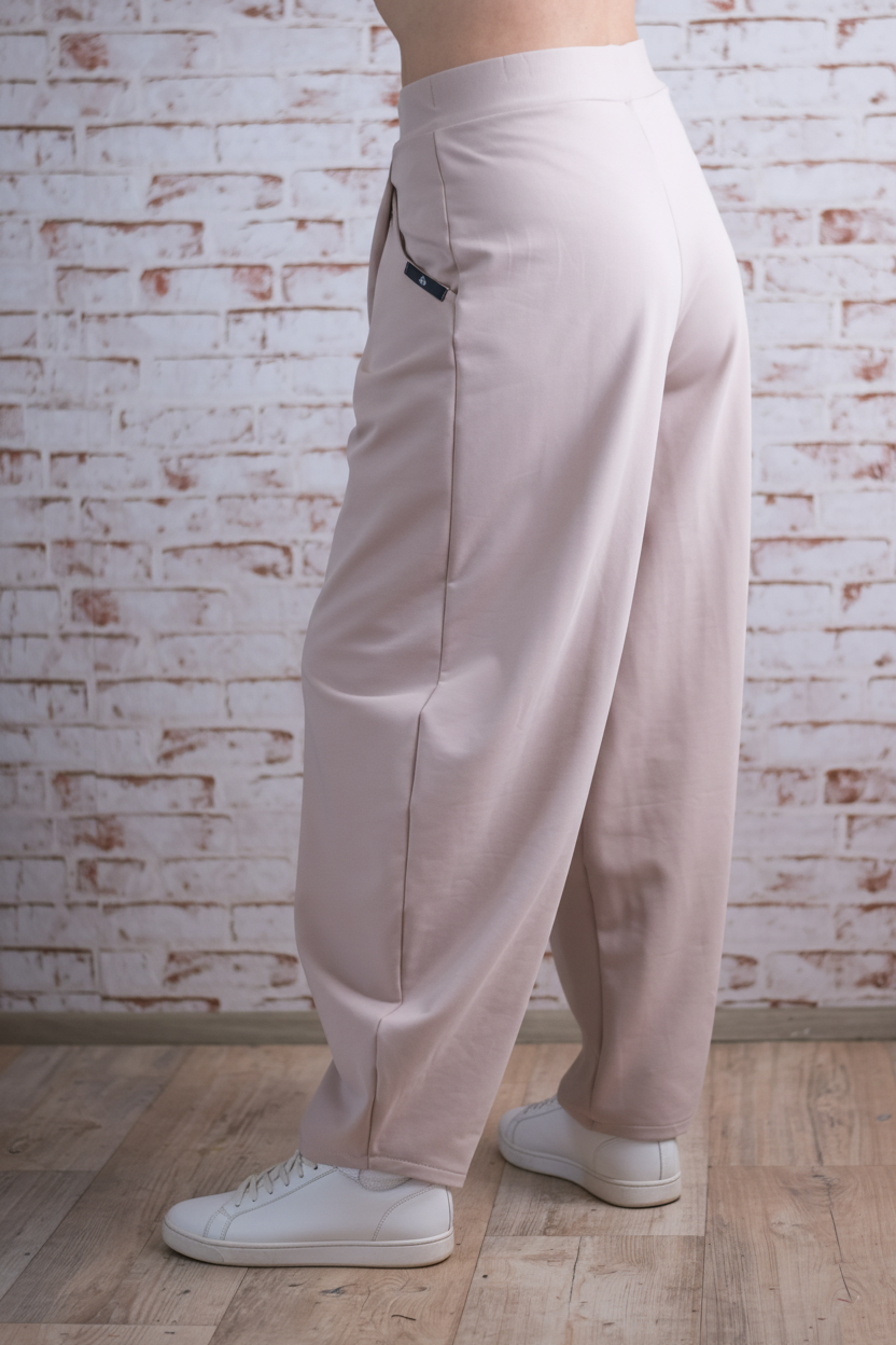 - Volná silueta, komfortní pas, jemné sklady u kapes