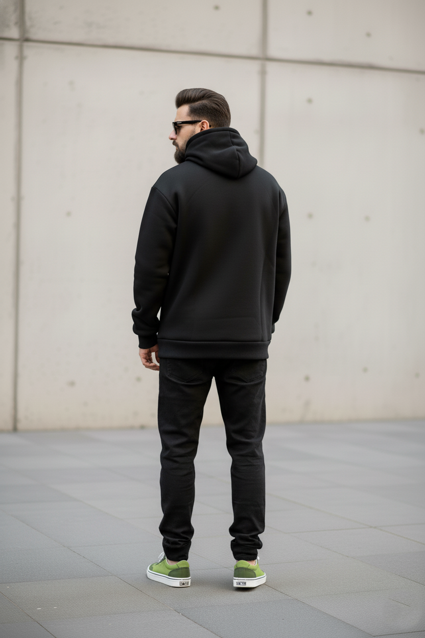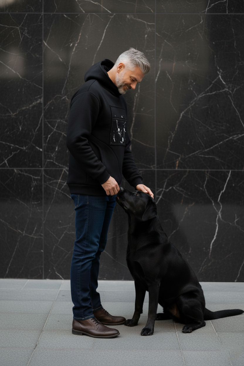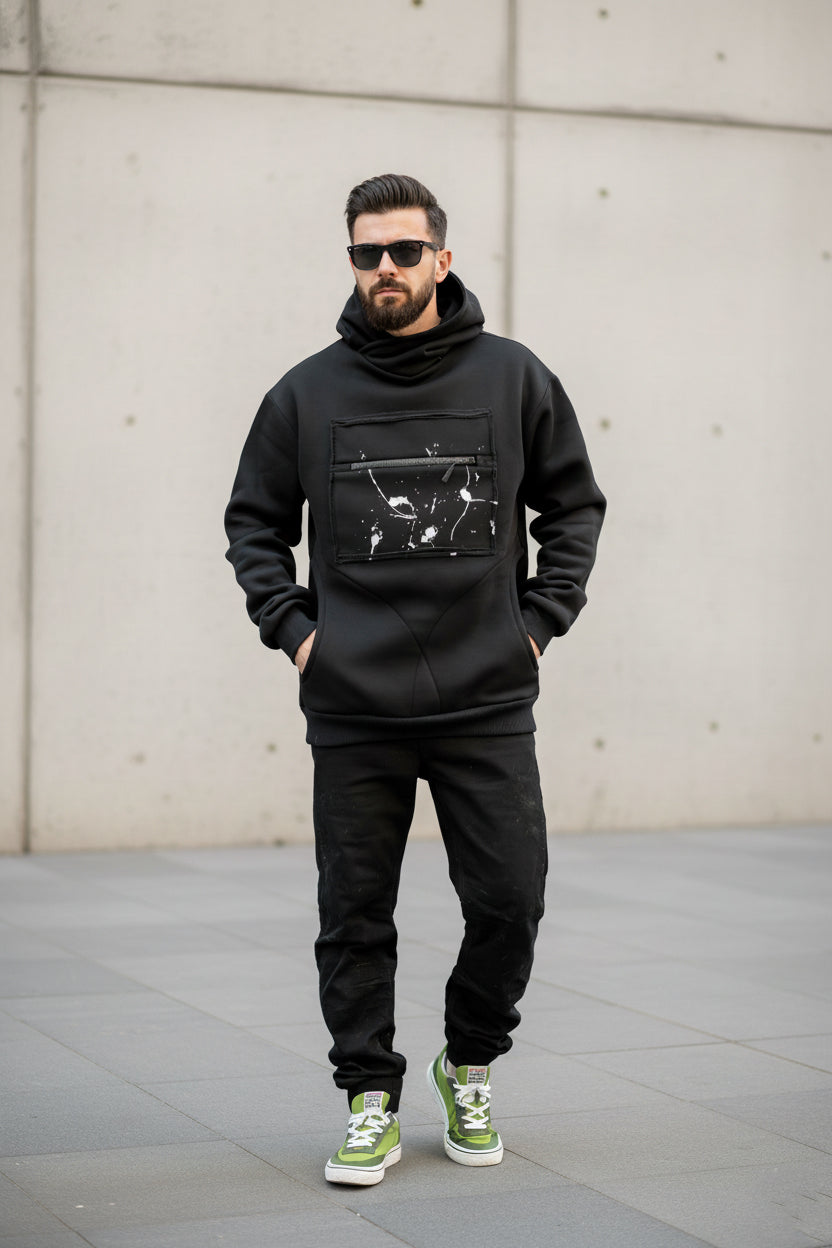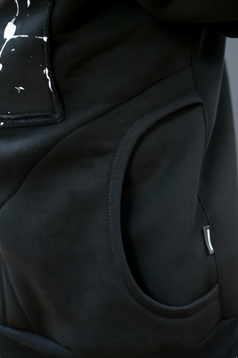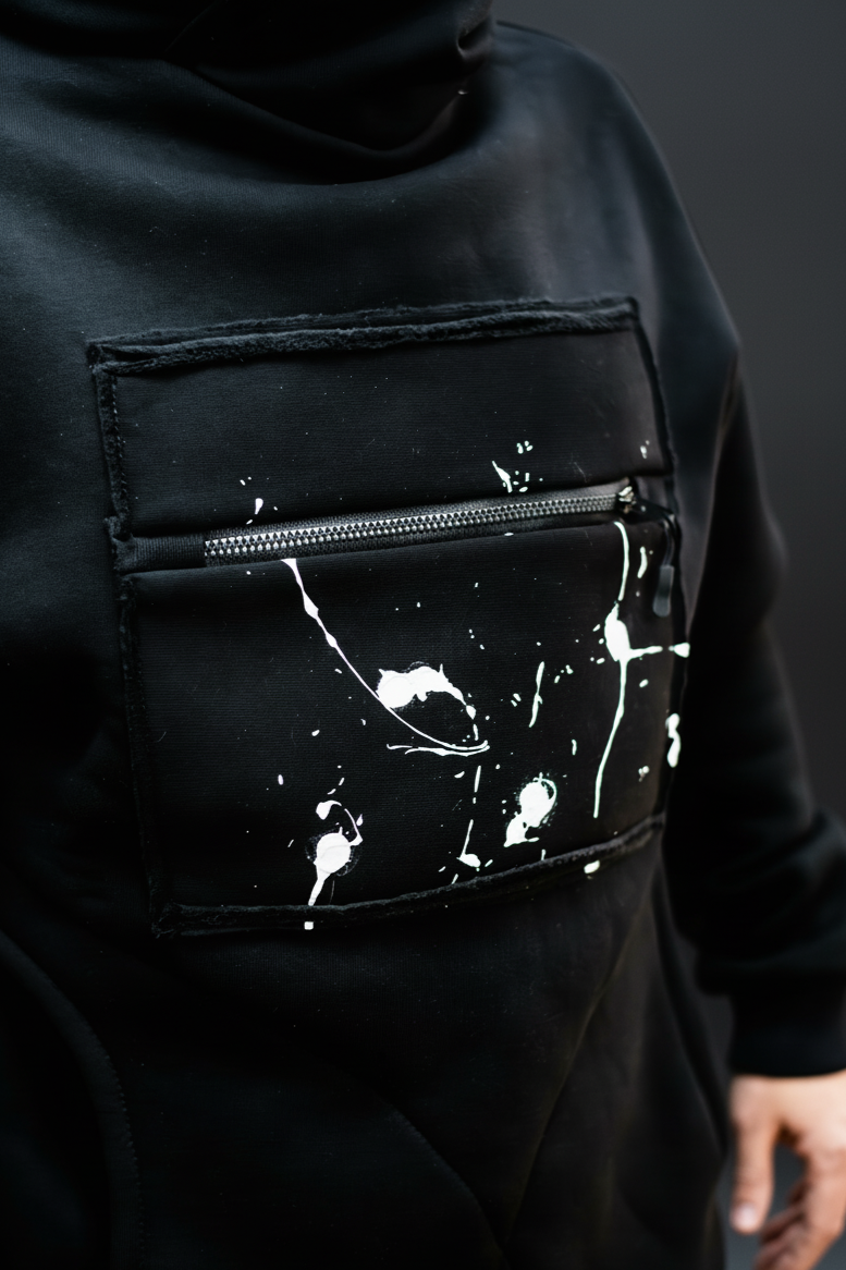 Elegantní černá mikina, která spojuje minimalistický styl s ruční tvorbou. Přední kapsa je znovu kolorovaná naší původní technikou – každý kus má jinou kresbu, a proto je každá mikina naprostý originál.