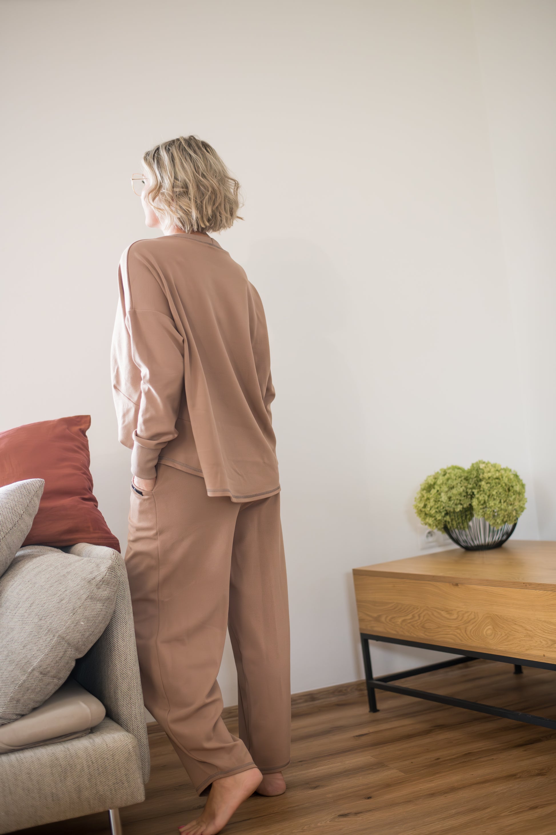 Styling tip: Souprava Piké v odstínu kapučíno působí čistě, přirozeně a elegantně – skvěle vypadá s bílými teniskami nebo koženou kabelkou v kontrastním tónu.