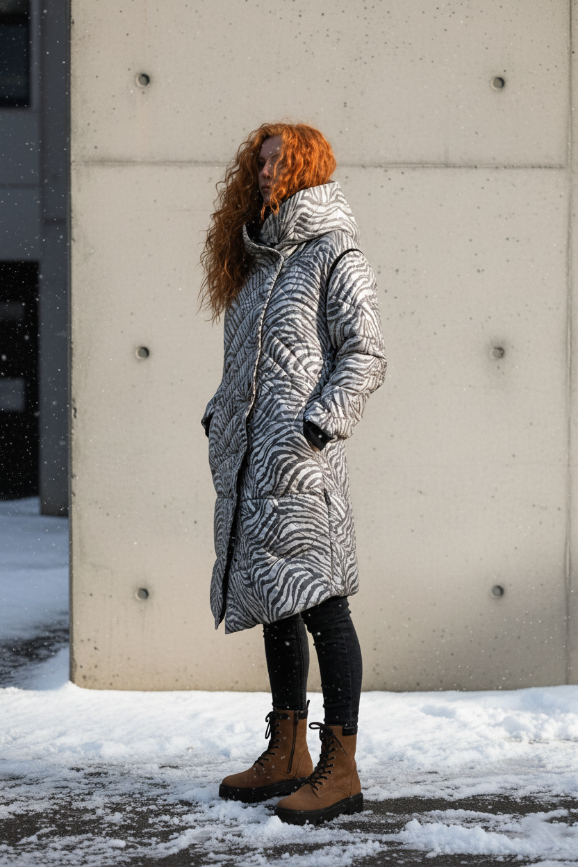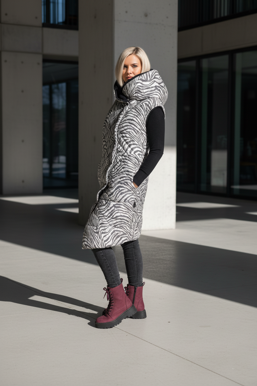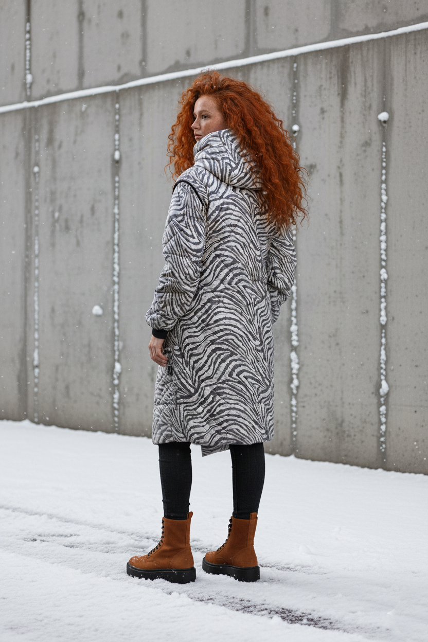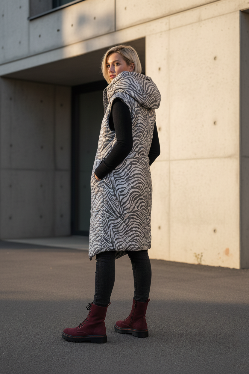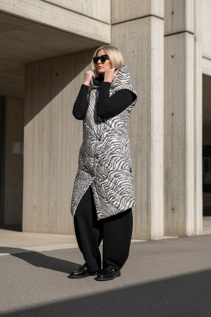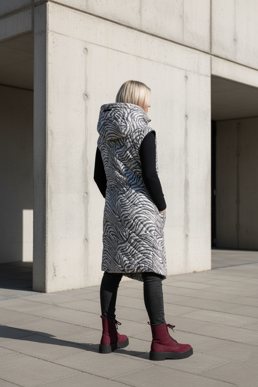 Zimní kabát 2v1 s odepínacími rukávy – Bílý tygr je originální kousek, který tě udrží v teple a stylu zároveň. V chladných dnech hřeje jako kabát, a když se oteplí – odepni rukávy a máš vestu s charakterem. Praktický, elegantní a z limitované kolekce inspirované silou bílého tygra. Každý kus je ručně šitý v Orlických horách.